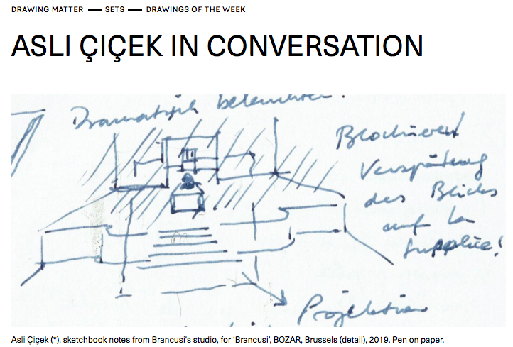 A conversation with Sarah Handelman about exhibition architecture. The dialogue departs from the sketches on Brancusi. Sublimation of Form. project and elaborates on the influence of Ottoman miniature drawings on Aslı Çiçek's design process and their translation into an object-based design method.