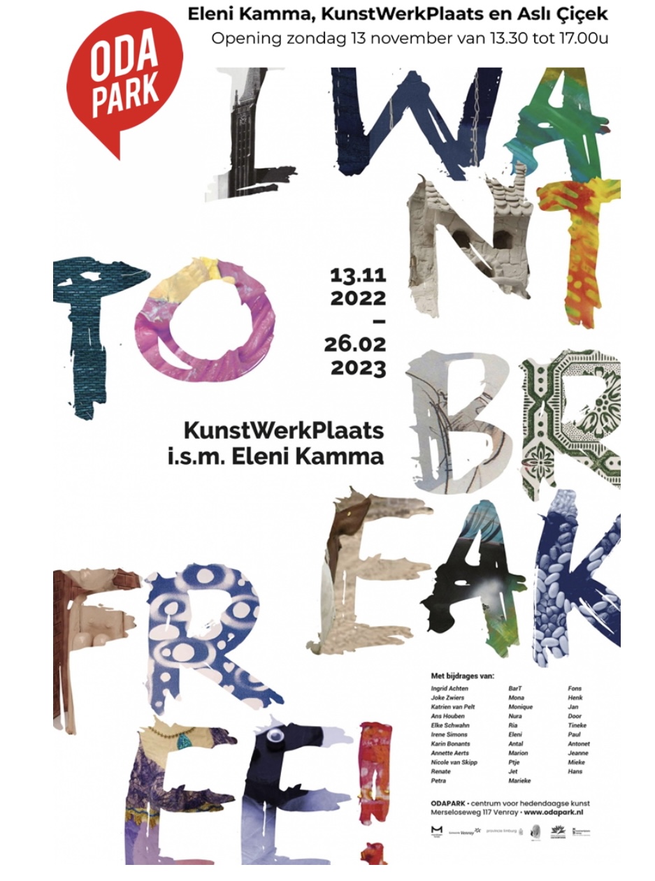 Visual artist Eleni Kamma invited Aslı Çiçek to design I WANT TO BREAK FREE exhibition. In this collaborative project Kamma worked as a curator over a year with the participants of KunstWerkPlaats Venray, a creative day care for people with mental or physical vulnerability.
