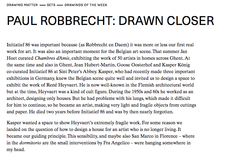 Paul Robbrect talks to Sarah Handelman and Aslı Çiçek about the drawings of Initiatief'86 exhibition and Aue Pavilions (Documenta 1992), two projects that played a crucial role on the relation between architecture and art in the oeuvre of Robbrecht en Daem architecten.