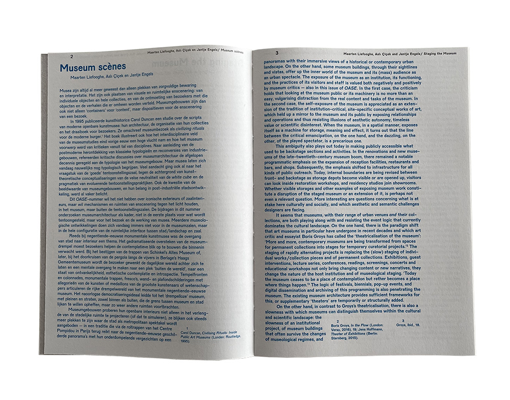 "... The thirteen essays in this OASE issue speculate on the importance of the architectonic staging of the museum visit or activity, and highlight generally one dimension of this question within one building. The scenes of the museum are not examined on the typological level of the museum building, but in an exploration of meaningful places, building fragments, or motifs. The issue thus takes a walk that starts in the (urban) landscape, then crosses the interior landscape of museums, over stairs, bleachers, and other theater-like situations, before finally looking out over the city again from within the museum. Between the ten contributions of our guest authors, we as editors also inserted three punctuated interludes. They are emblematic of the fragmentary reading of museum buildings that occurs in most longer texts as well. Attention is paid to rhetorical aesthetics, to the evolving codes and conventions of both the dressed and the stripped-down public interior. The museum is structurally a place of contradiction - it screens and unpacks, it seeks to enchant and expose, to build and scatter attention. In individual museum buildings this exciting simultaneity is sometimes played out, sometimes covered up or smoothed over, but most of all it is dismantled into juxtapositions and sequences of moments, specific places, and images - into scenes."